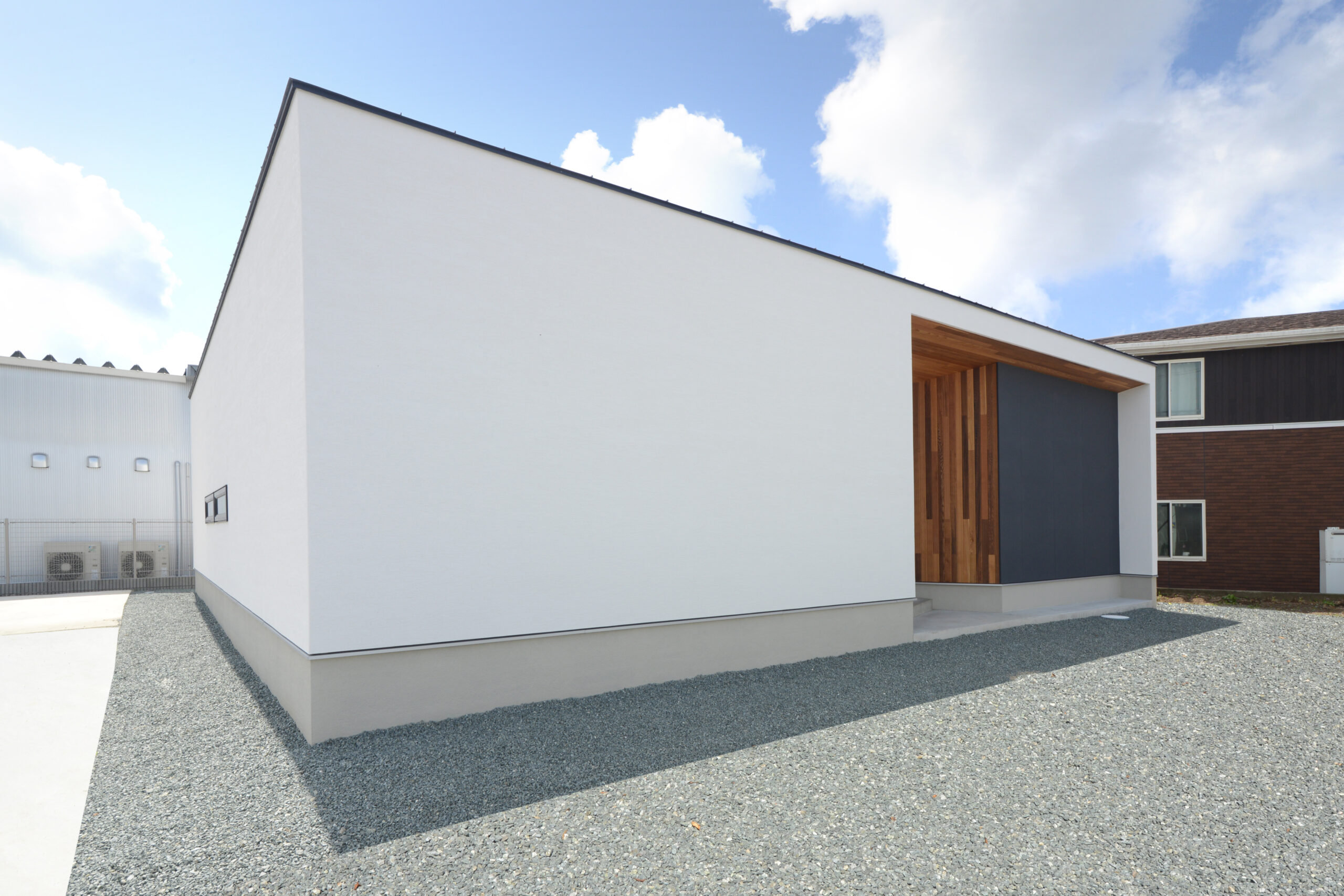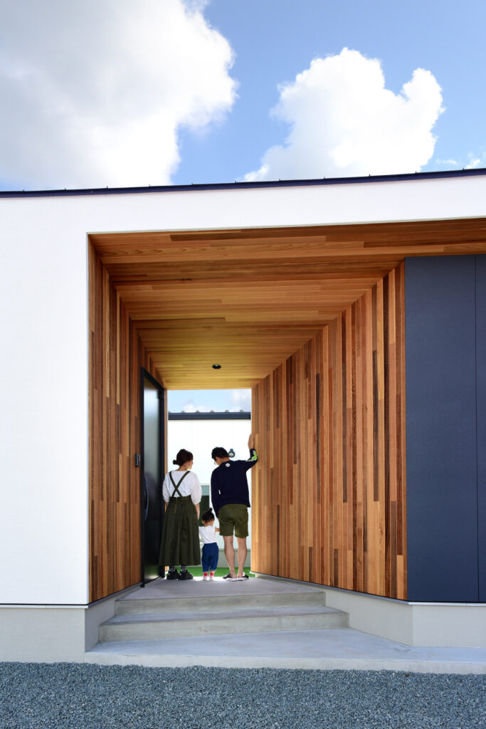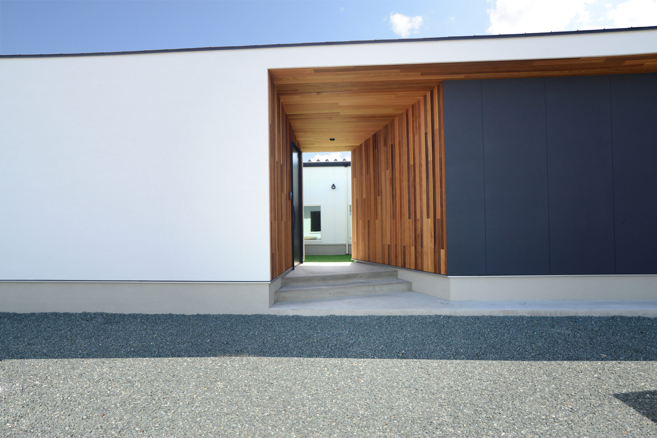 かまえのいえ 車通りの多い国道沿いに誕生した、外壁に窓がない正 方形の平屋です。シンプルな外観ながら、個性のある 構えに目を惹きつけられます。四方からのプライバシーを守りつつ、豊かな時間を与 えてくれる中庭のある暮らし。窓にはトリプルガラス を採用し、国道沿いを通るバイクやトラックなどの音 問題も解決する事ができました。家具やインテリアが大好きなご夫婦のこだわりが詰 まった LDK も魅力のひとつです。 Check Point 木貼りでインパクトのある玄関ポーチ。その先にあるの中庭が特徴です。 トリプルガラスで静かな室内は生活のしやすさにもこだわった居住空間です。 Performance C値(相当すき間面積) 0.122 cm² /m² Ua値(外皮平均熱貫流率) 0.41W/ m² K 一覧へ戻る
