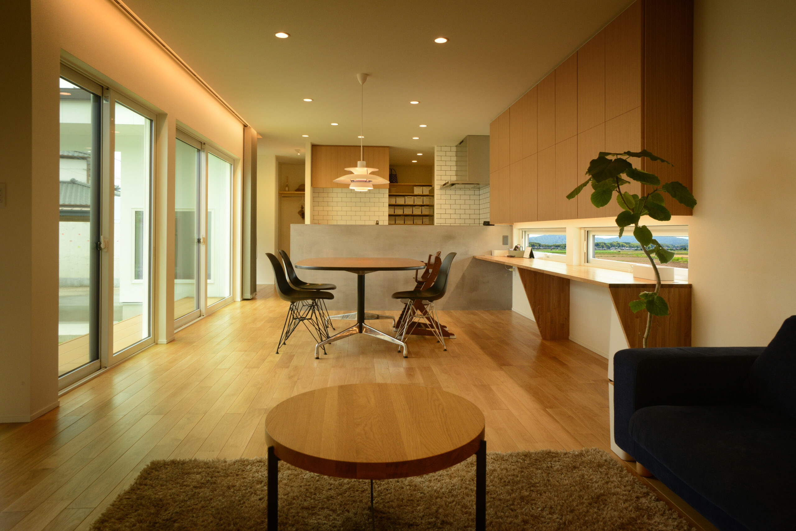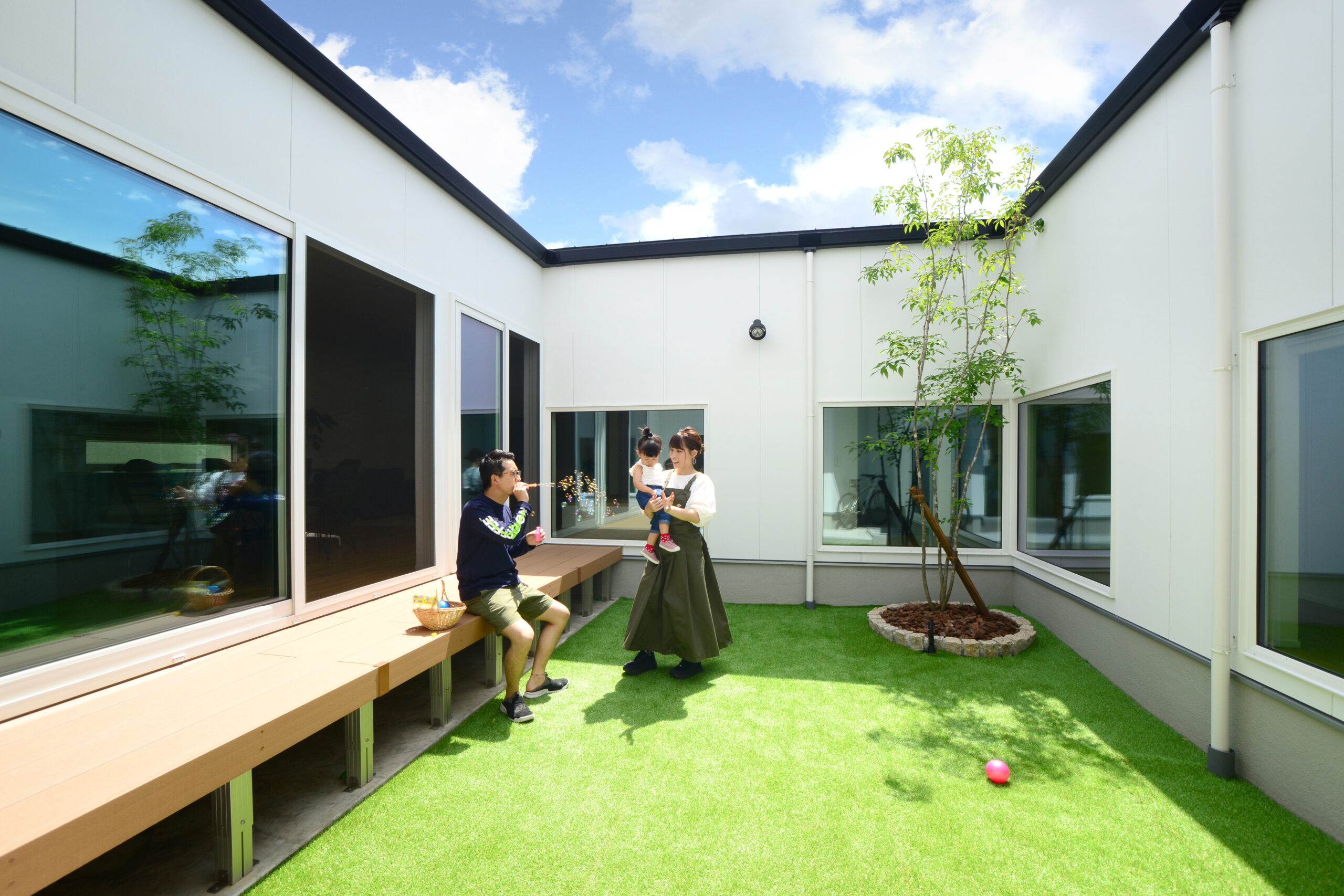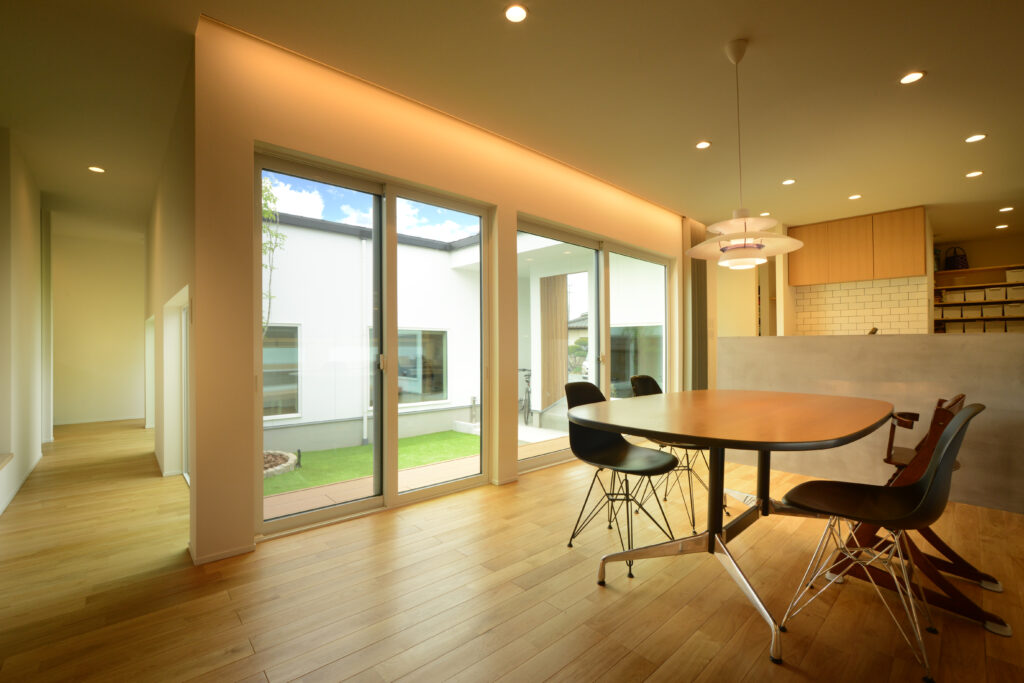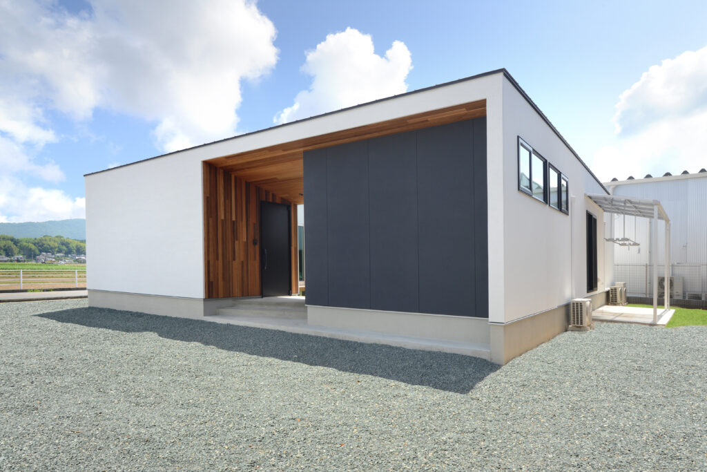 かまえのいえ 車通りの多い国道沿いに誕生した、外壁に窓がない正 方形の平屋です。シンプルな外観ながら、個性のある 構えに目を惹きつけられます。四方からのプライバシーを守りつつ、豊かな時間を与 えてくれる中庭のある暮らし。窓にはトリプルガラス を採用し、国道沿いを通るバイクやトラックなどの音 問題も解決する事ができました。家具やインテリアが大好きなご夫婦のこだわりが詰 まった LDK も魅力のひとつです。 Check Point 木貼りでインパクトのある玄関ポーチ。その先にあるの中庭が特徴です。 トリプルガラスで静かな室内は生活のしやすさにもこだわった居住空間です。 Performance C値(相当すき間面積) 0.122 cm² /m² Ua値(外皮平均熱貫流率) 0.41W/ m² K 一覧へ戻る