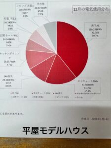 12月分の電気使用を円グラフでまとめました。このモデルハウスは、床下エアコン(6…
