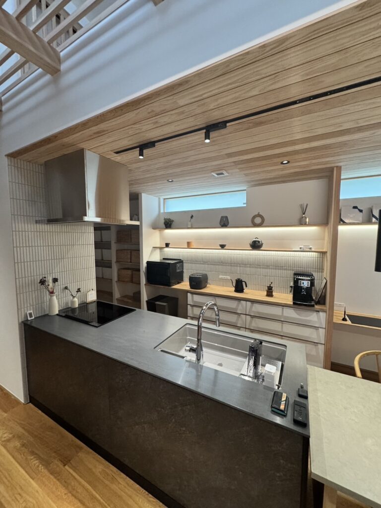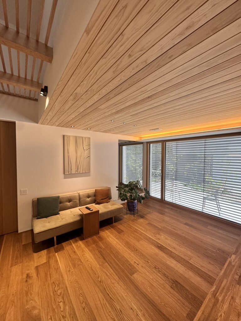 2025年09月29日(水) 熊本県北初 パッシブハウス 申請中🍀 木の質感を活かした深い軒のデザインが印象的な外観。外付けブラインド「ヴァレーマ」により、季節ごとの日射コントロールを実現。夏は強い陽射しを遮り、冬は暖かな光を取り込み、快適で省エネな暮らしを支えます。 木目が美しい天井と床が調和し、やわらかな光が室内を包み込む空間。全館空調を一台で運転し、家中どこにいても温度差の少ない快適な住環境を実現しています。リビングやキッチンはシンプルで機能的なデザインながら、自然素材の温もりが感じられる落ち着いた雰囲気を演出。是非体験しに来てください😊お待ちしております🍀