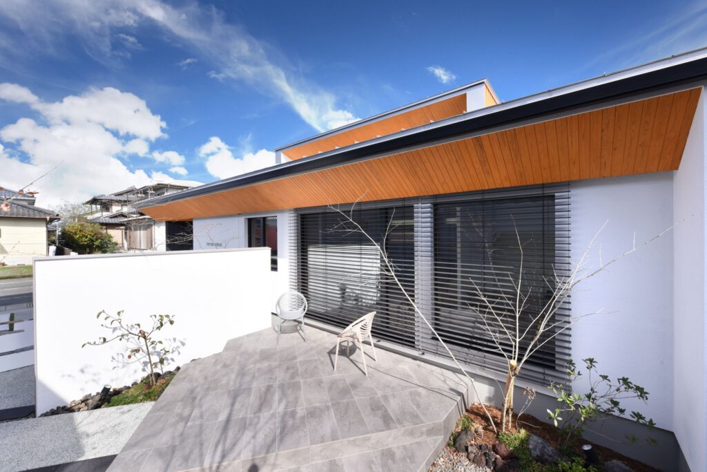 夏は、南側サッシのすべてに外付けブラインドを設け、さらに塀を設けているので西日対策も万全です。