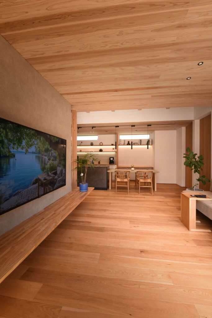室内の仕上げは、昔から製材所で過ごした、杉材を天井に張り、壁仕上げは、ドイツから取り寄せた土をつかった塗壁で仕上げています。