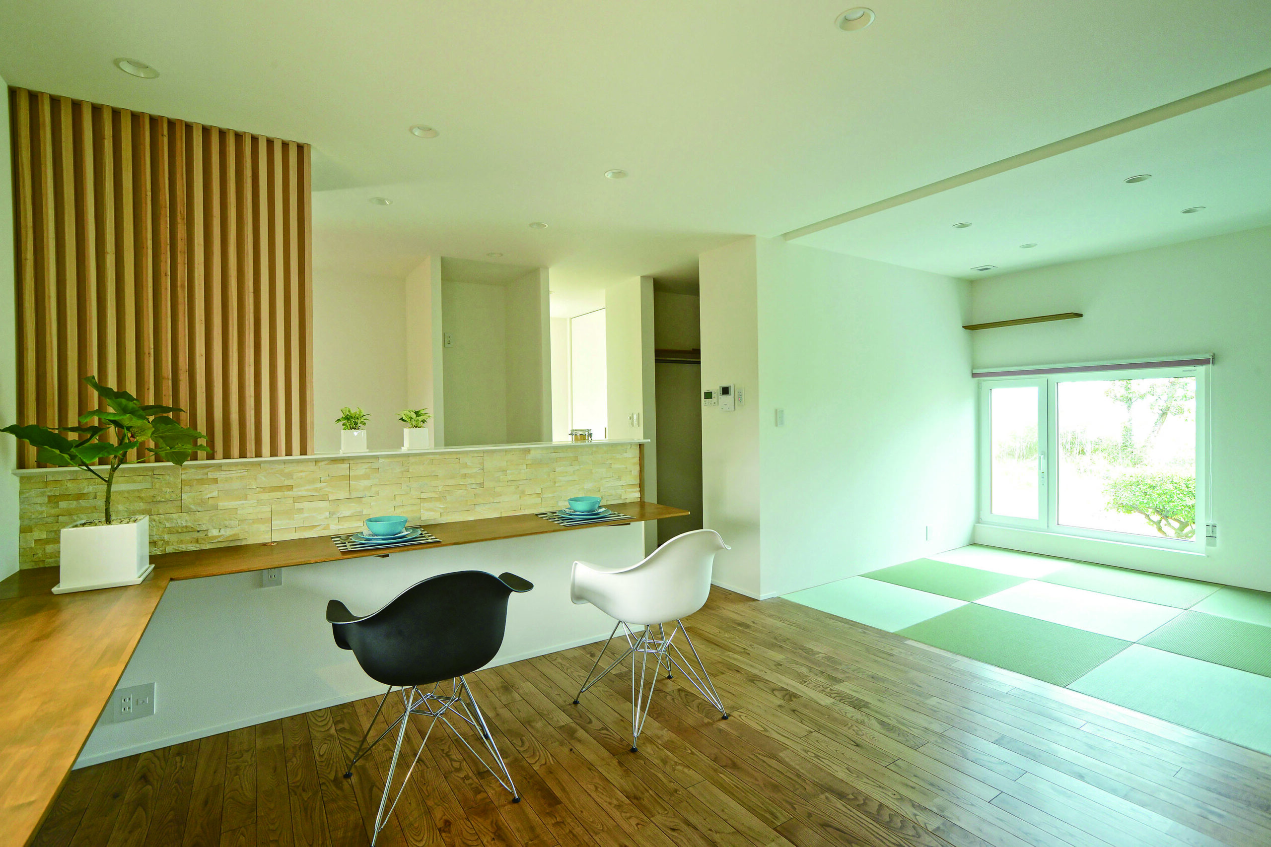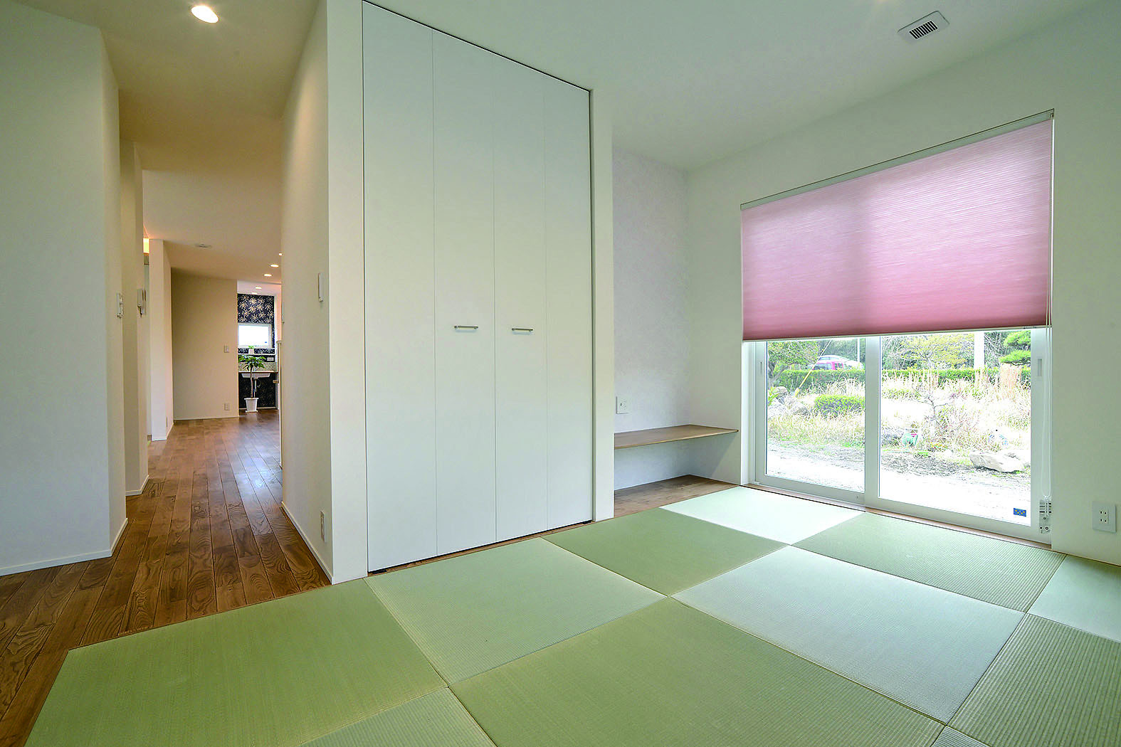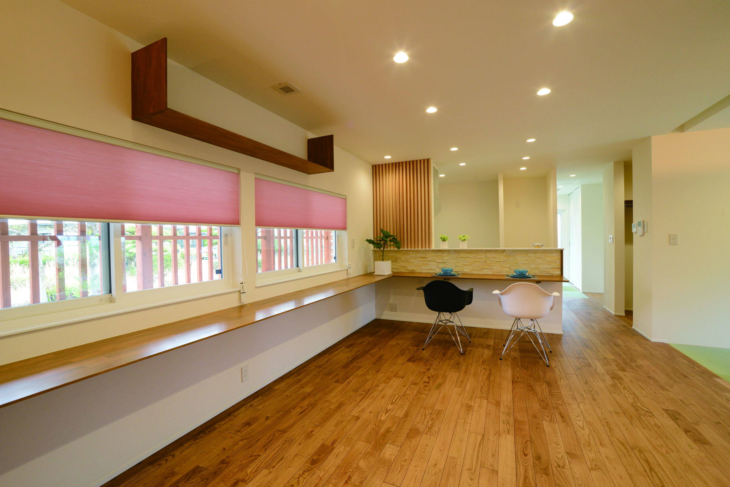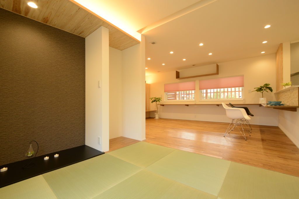 やさしい温度に包まれる、のびやかな平屋の家 住まいの中の温度差をできるだけ抑え、一年を通して快適に過ごせることを大切にした平屋の住まいです。高い断熱性能と気密性により、夏の暑さや冬の寒さをやわらかく受け止め、冷暖房に頼りすぎない安定した室内環境を実現しています。LDKは家全体とゆるやかにつながるワンフロア構成とし、視線が抜けることで実際の面積以上の広がりを感じられる空間に。素材の質感や光の入り方にも配慮し、時間帯によって表情が変わる心地よさも魅力です。日々の暮らしを静かに、そして快適に支える住まいとなりました。 Check Point 窓は世界基準の高度な断熱性を誇るトリプルガラスを使用しました。 和室とリビングがフラットにつながり、広がりのある快適空間です。 Performance C値(相当すき間面積) 0.16 cm² /m² Ua値(外皮平均熱貫流率) 0.36W/ m² K 一覧へ戻る
