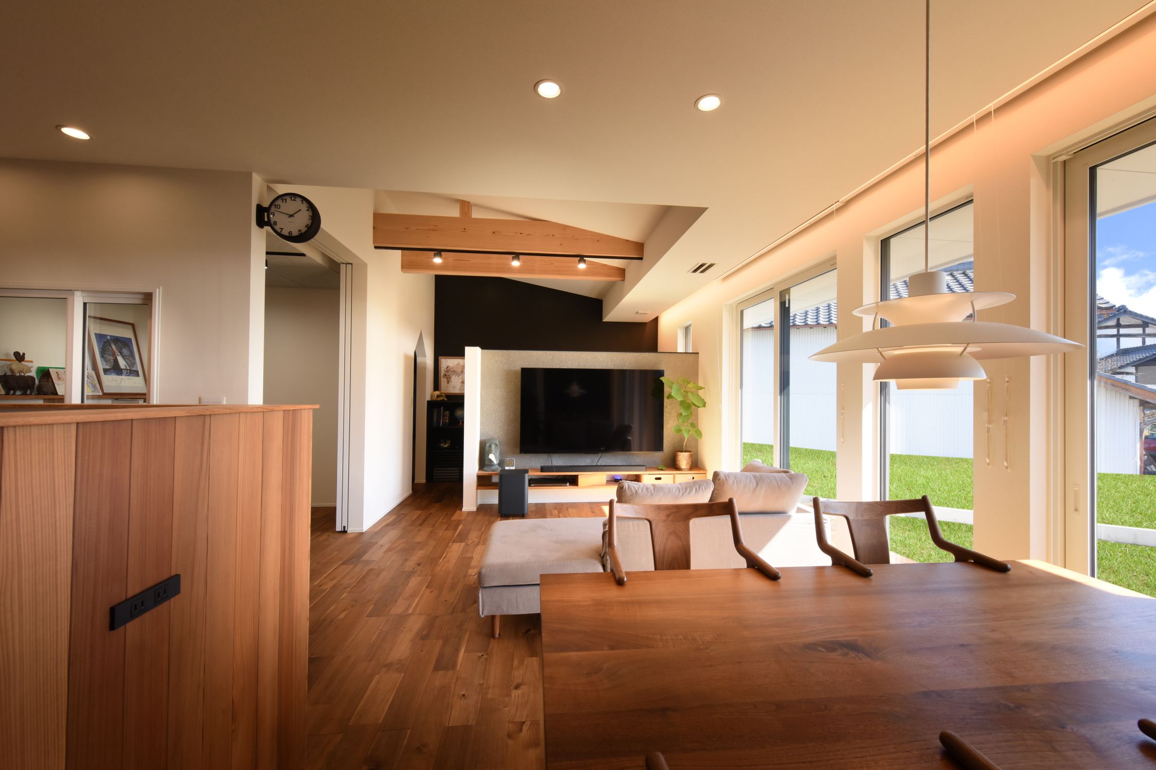 シックな雰囲気のリビング、照明や家具などインテリアもこだわっている。