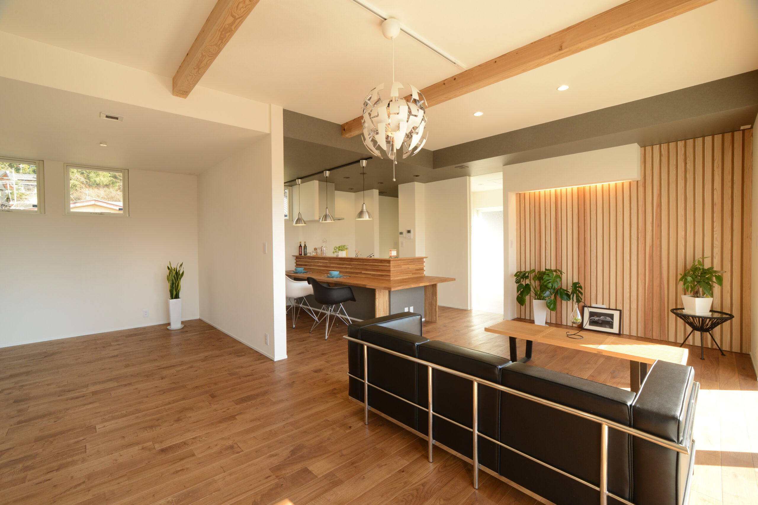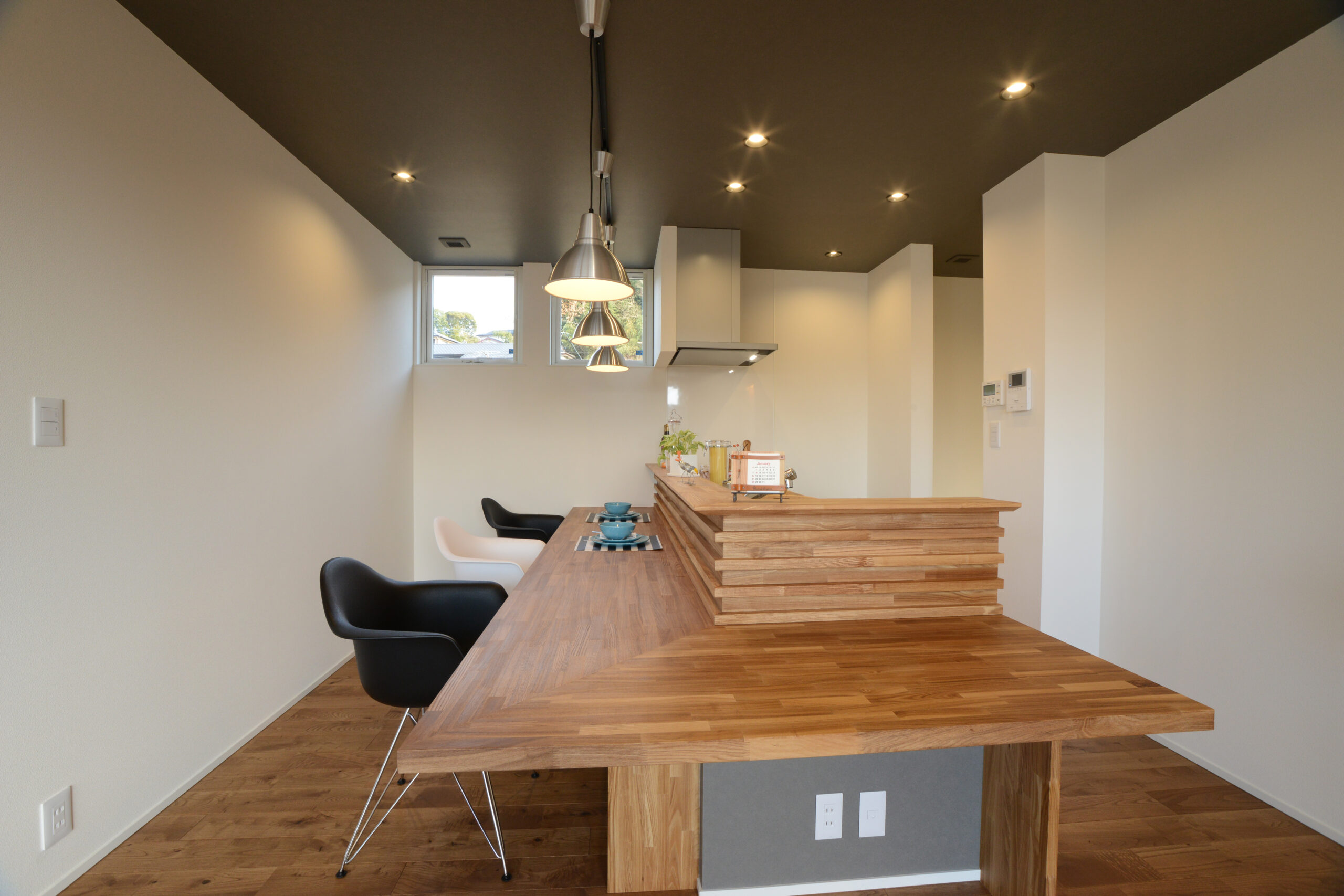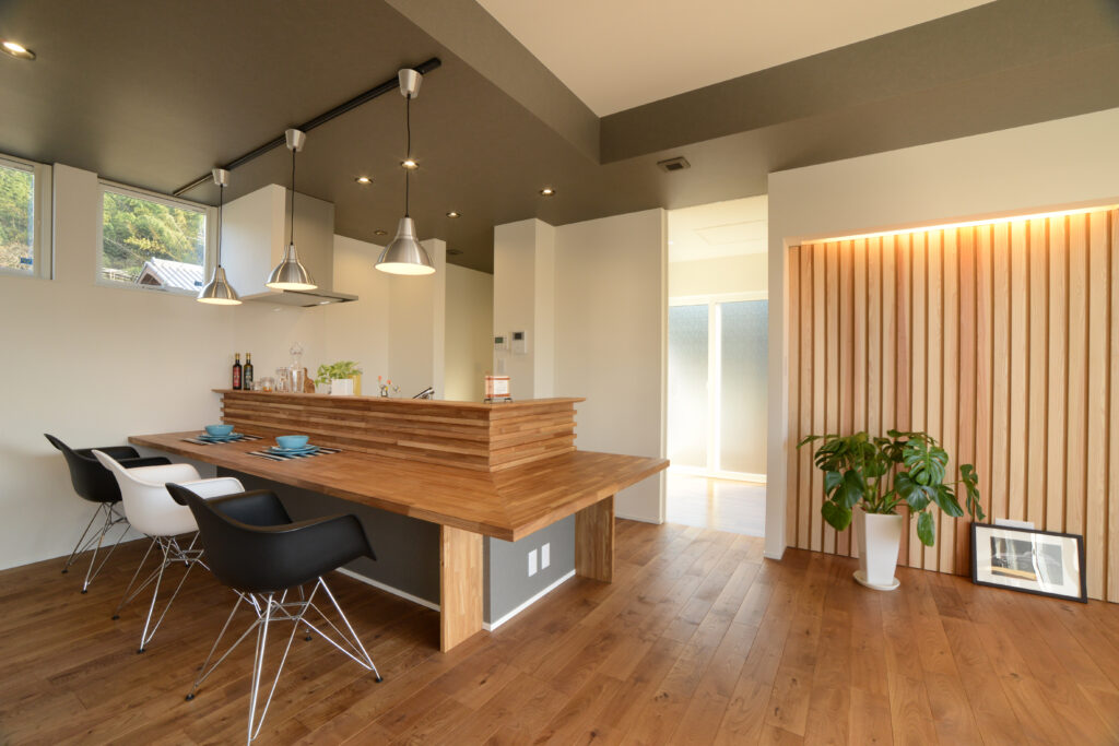 内と外を紡ぐ平屋 家の内と外の一体感を意識し、その象徴としてリビングに設けた大窓からは、中庭の開放感と景観を楽しむことができます。要望だったカウンターキッチンは、食事はもちろんのこと。勉強やデスクワークなど、様々な用途で家族が集う空間になりました。今ではホームパーティーやBBQで、ご家族やご友人など、たくさんの方が集い、新たな暮らしを紡いでいらっしゃいます。 Check Point 昼と夜で表情が変わるこだわりのカウンターキッチン。 Performance C値(相当すき間面積) 0.1 cm² /m² Ua値(外皮平均熱貫流率) 0.39W/ m² K 希望の暮らしに沿った 住まいが実現しました。 のびのびした子育て考えて新築にしようと決めました。私達の生活を一番に考えながら、災害にも強く、格好いい家をつくることができました。立山建設の皆さまの丁寧な対応のおかげで、家族の温もりを感じながら幸せな毎日を過ごしています。 一覧へ戻る
